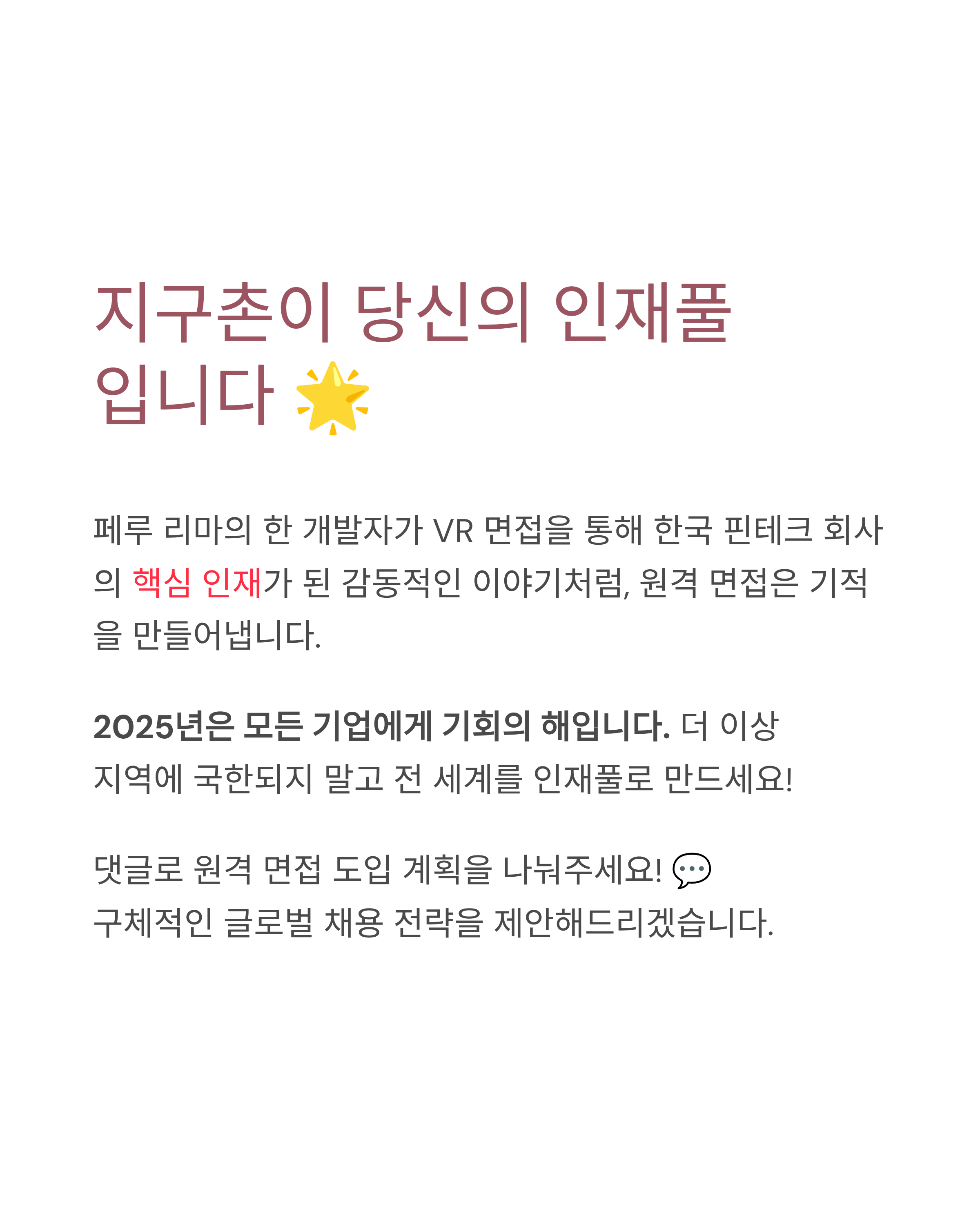 2025년은 모든 기업에게 기회의 해입니다. 🚀 더 이상 서울, 부산에 국한되지 마세요. 전 세계가 여러분의 인재풀입니다. 지구촌 어딘가에 여러분 회사를 위한 완벽한 인재가 여러분을 기다리고 있습니다.